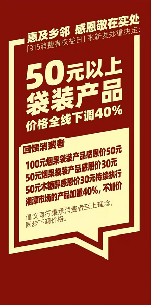 目前,100元烟果袋装产品下调为感恩价50元,50元烟果袋装产品下调为感恩价30元,50元木糖醇全国感恩价30元的活动持续执行。