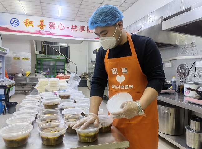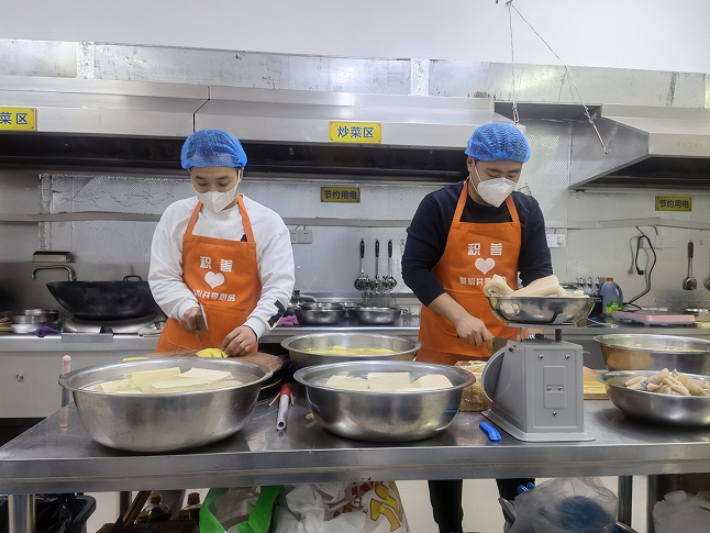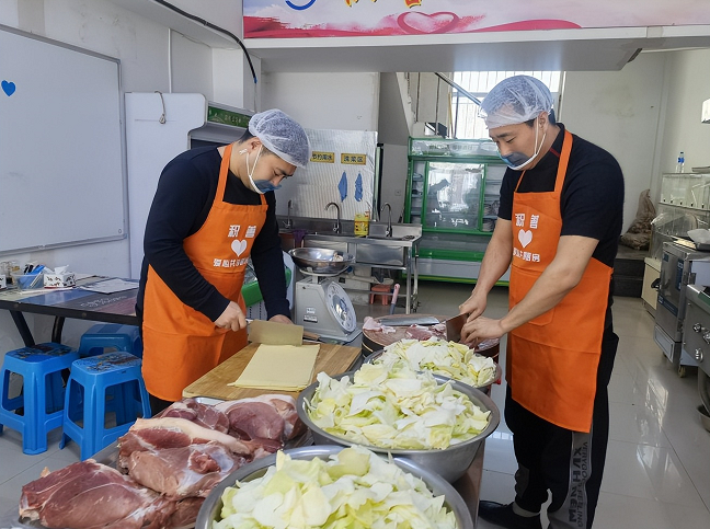 (左一为出租车司机毛雨坤休息时间到爱心共享厨房帮厨)