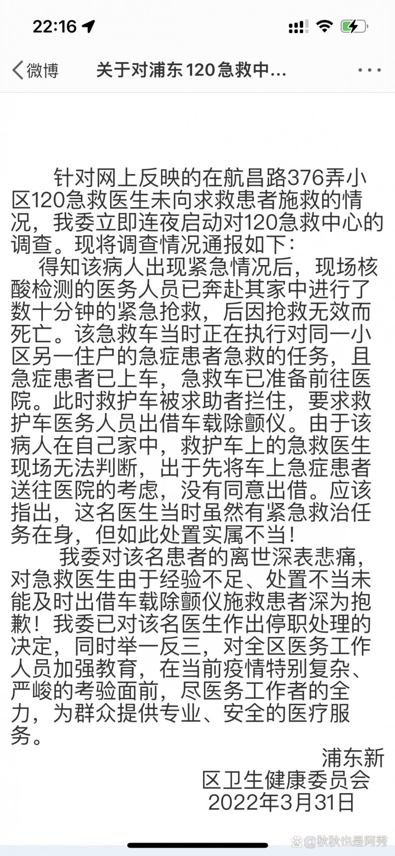 看到通告,120的医生已经被停职。其实我不想看到的就是在疫情期间医疗资源匮乏的情况下,还有医生因为这种事无法在一线去救助更多的人,给更多的人带去生的希望。我很难过。毕竟属于我父亲的120等了1个半小时才来。
