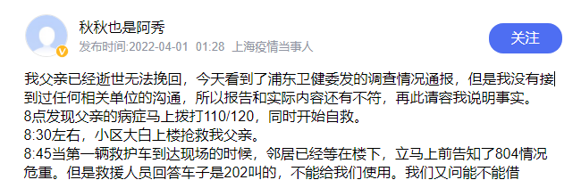 我父亲已经逝世无法挽回,今天看到了浦东卫健委发的调查情况通报,但是我没有接到过任何相关单位的沟通,所以报告和实际内容还有不符,再此请容我说明事实。
