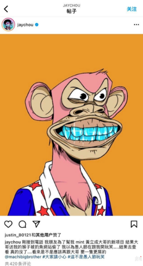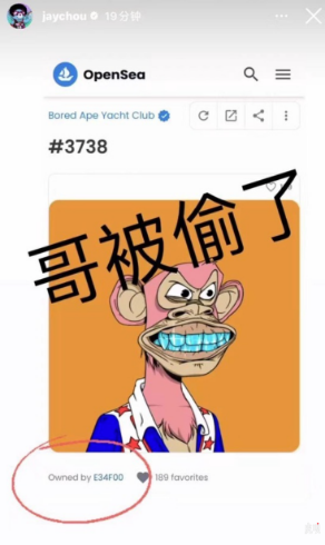 据蓝鲸财经,周杰伦在社交平台上发文称,其持有的 BAYC #3738 NFT 已被盗。据了解,该NFT在今年1月由黄立成(MachiBigBrother)赠送。另据Opensea与Ethscan信息显示,该NFT在1小时前从周杰伦地址转出,并很快以130ETH、155 ETH的价格在LooksRare多次转手交易。以当前ETH价格计算,周杰伦的NFT价值超过50万美元。
