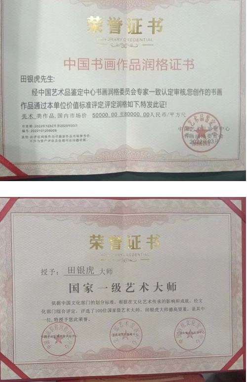 田银虎,1950年生于陕西宝鸡,国家博物馆画廊编委、中国书画协会名誉主席、中国将军诗书画研究院理事、陕西省美协会员、高级手工装裱师。代表作品有:《万山红遍》(1996年陕西省职工绘画大赛特等奖)、《太白金秋》(2001年在韩国展出)、《二龙戏珠》(1999年在《陕西日报》成立60周年大型刊物《迈向新世纪》上发表)、《万山红遍层林尽染》(2000年12月在中国美协于郑州举办的中国画、书法精品大展中入选)、《松下问童子》(2002年入选《世界书画家大辞典》)、《富贵吉祥》(2004年3月在《中国书画报》发表)、《青山绿水》(2005年在《中国书画报》发表)、《盛世中华》。(2017年入选“行一带一路、品墨韵中华”全国美术人才作品展并被收藏)等。作品先后被中国美术馆、国家博物馆、人民大会堂、钓鱼台国宾馆、中央电视台、解放军总政治部、解放军总后勤部、《人民政协报》等单位收藏。作品在中国人民革命军事博物馆展出,并被介绍于2003年《人民日报·海外版》“中国艺苑名家”栏目。2008年作品《秀美山川》在首届“和谐颂”全国公益书画大赛中获金奖;《秦岭风光》在“品牌中国”书画名人迎奥运大赛中获金奖,该作品被活动主委会收藏,并在全国巡展;《富贵牡丹图》在中国社会工作协会举办的“翰墨情深寄汶川——百名老年书画家赈灾大义卖”活动中荣获贡献奖。2012年1月28日,在中央电视台举办的中国文艺展示活动中获“德艺双馨”特殊贡献奖。