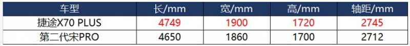 相比捷途X70 PLUS,宋PRO在长宽高及轴距尺寸上都略逊一筹,俩车放在一起,后者明显稍小一圈。这也意味着,宋PRO的空间表现也不如前者。