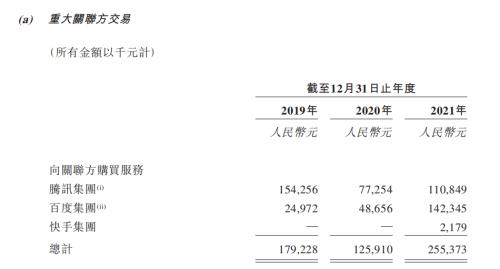 百度、快手、腾讯和知乎有大量关联交易。2019年至2021年,知乎向关联方购买服务累计5.6亿元(图7),其中,腾讯旗下阅文集团、腾讯云等都为知乎提供服务,合计赚走3.4亿元。