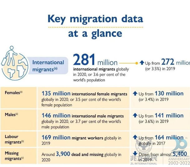 兆龙移民:近日,联合国移民署最新发布的《2022世界移民报告》中对移民群体、移民诉求、移民项目等内容进行了权威展示与解读,为广大投资者选择移民和定居国家提供参考。接下来兆龙移民就从其中几个重要数据为大家带来解读。