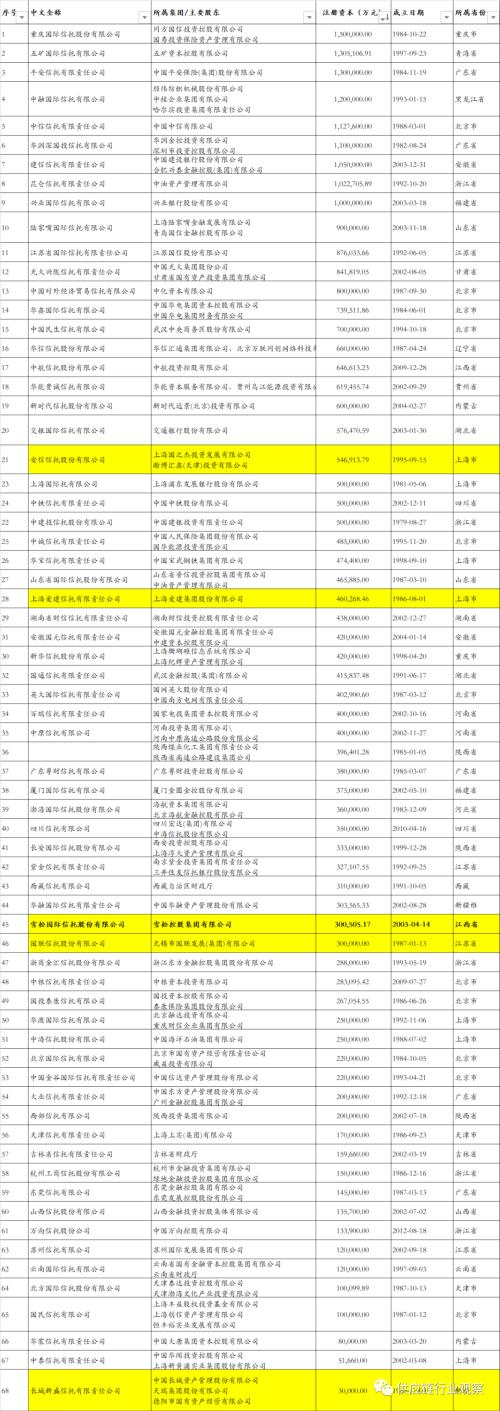 根据2022年3月31日银保监会发布的银行金融机构法人名单,截至2022年3月31日,我国共有68家信托公司,名录如下:
