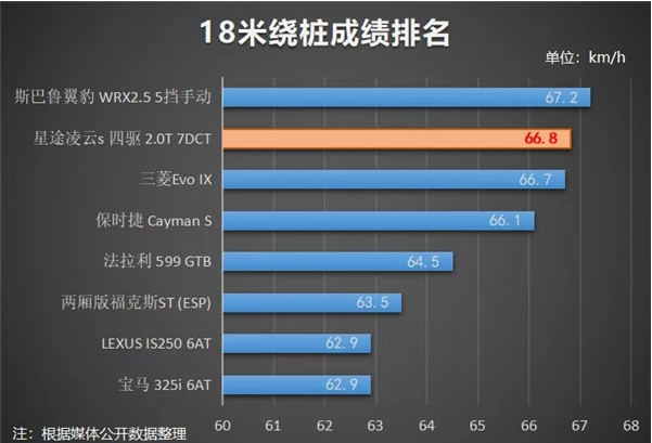 作为考量车辆指向性、循迹性的定点绕圆项目,星途凌云取得了31.3秒的好成绩。我们发现,星途凌云S用了9.7s时间完成高速绕桩,平均速度高达66.8km/h成绩,已经优于所有市场上在售SUV车型,且仅有一款豪华品牌轿车曾创造过67.2km/h的极限成绩,仅比此次凌云s快了0.4km/h。