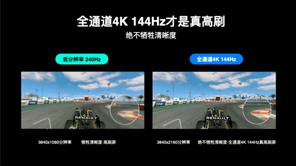 而出现这种情况的原因很简单,一些厂商为了获得视觉流畅度的增加,它们会通过同时扫描两行像素的方式对刷新率进行加倍,这样最高可以实现240Hz的刷新率。但这种操作虽然让画面流畅度更高了,分辨率却下降了一半。对于用户来说需要做非此即彼的选择题,想体验到极致的刷新率,就不得不面对分辨率的损失。TCL真高刷电视T7E之所以会在画面显示上以全通道 4K 144Hz刷新率完胜240Hz的电视,原因在于它带给我们的是屏幕原生刷新率。