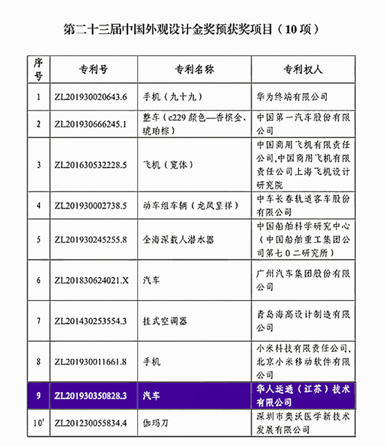 中国知识产权的最高奖项为中国专利奖,是中国唯一的专门授予专利发明创新给予的奖励,该奖项受到联合国世界知识产权组织的认可,代表着中国自主创新的最高水平。而在2022年第23届中国专利设计金奖名单中,华人运通高合汽车赫然在目,同名单的还有全海深载人潜水器“奋斗者号”、大型远程宽体客机CR929等国之重器。