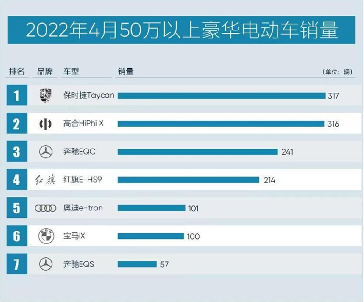 销量不仅代表人们对该车型的接受度,还透露出国人对该品牌的信赖和认可程度,而对于汽车市场而言,销量很大程度上决定了未来的市场方向。随着2022年5月的到来,2022年4月的交强险上险数据浮出水面,让我们一起来看看4月份50万豪华纯电领域呈现出怎样的景象?从数据中我们可以看到,高合HiPhi X以316量的销售成绩与保时捷Taycan展开搏斗,两者销量上相差一辆,一同站上50万家豪华纯电销量排行榜第一阶梯。
