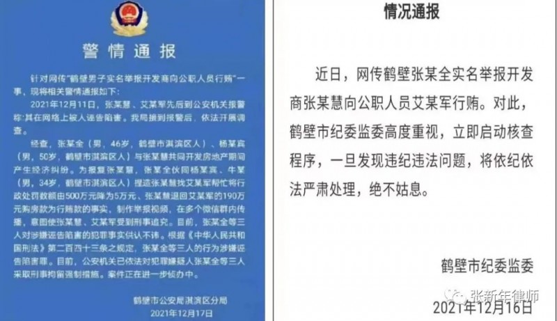 2021年12月16日鹤壁市纪委监委发布《情况通报》称:“近日,网传鹤壁张某全实名举报开发商张某慧向公职人员艾某军行贿。对此,鹤壁市纪委监委高度重视,立即启动核查程序,一旦发现违纪违法问题,将依纪依法严肃处理,绝对不姑息。”但在此之前,淇滨分局即已抓捕张某、杨某、牛某。