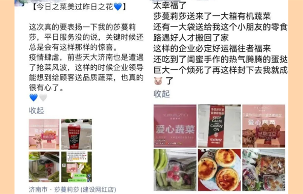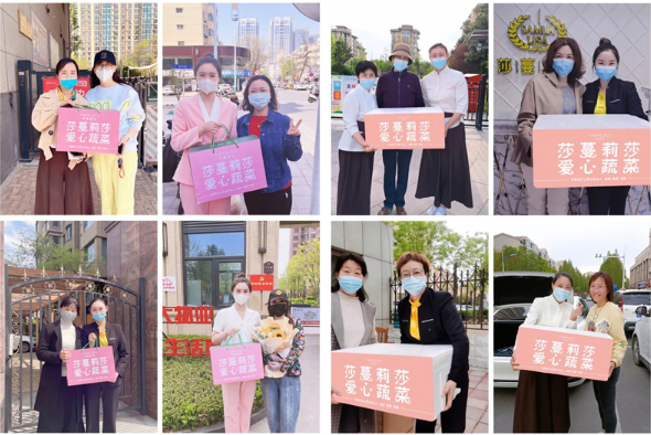 疫情无情,人有情!各个城市疫情爆发以来,莎蔓莉莎二十几个城市的门店全部闭店,面临着巨大的损失与困难,但是在关键时刻,莎蔓莉莎勇敢担起一家企业的社会责任,积极组织具有医学背景的员工参加到抗疫志愿者的队伍中去,经过大家齐心协力的艰苦奋斗,有些城市的疫情整体平稳向好发展,部分区域与群众生产生活相关的菜店、药店、超市等服务性经营门店逐渐复工复产,莎蔓莉莎又出发,积极团购物资,为正在经历着疫情隔离的亲爱顾客送去新鲜蔬菜,表达自己的牵挂与祝福,尽显真情与温暖。