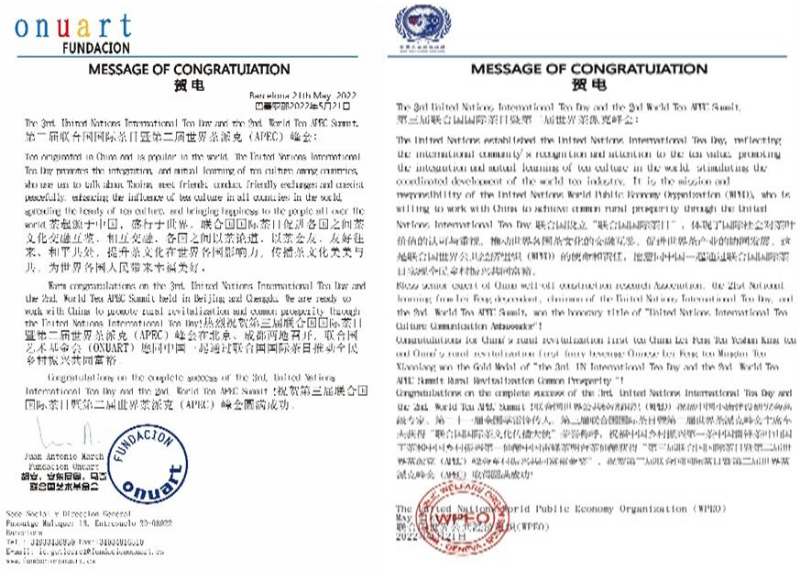 现场宣读了联合国艺术基金会(ONUART)和联合国世界公共经济组织(WPEO)贺电。联合国艺术基金会(ONUART)热烈祝贺第三届联合国国际茶日暨第二届世界茶派克(APEC)峰会在北京成都召开,愿同中国一起通过联合国国际茶日推动全民乡村振兴共同富裕。联合国世界公共经济组织(WPEO)有使命和责任推动世界各国茶文化的交融互鉴,促进世界茶产业的协同发展,祝贺第三届联合国国际茶日暨第二届世界茶派克(APEC)峰会取得圆满成功!