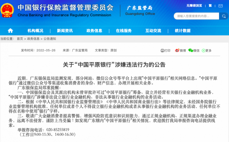 昨日,广东银保监局发布《关于“中国平原银行”涉嫌违法行为的公告》(下称《公告》),《公告》称,近期,广东银保监局监测发现,部分网站、微信公众号等平台上出现“中国平原银行”相关网络信息。“中国平原银行”通过微信公众号等渠道收集消费者的身份、财产信息,办理开展相关业务。