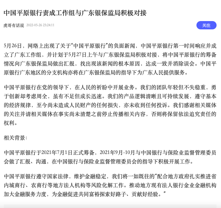 在上述公告中,中国平原银行称,在看到上述负面新闻后,第一时间响应并成立了广东工作组,计划于5月27日上午与广东银保监局对接,将中国平原银行的筹备情况向广东银保监局做出汇报,找出该新闻出现的根本原因,达成一致并消除误会。