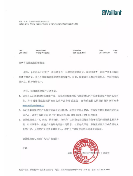 2018年德国威能就“平行进口”壁挂炉问题的声明