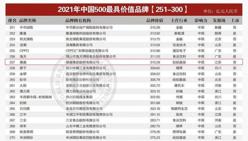 6月22日,由世界品牌实验室主办的“世界品牌大会”在北京召开,会上发布了2021年《中国500最具价值品牌》分析报告。雅鹿以310.29亿元的品牌价值位列第257名,在纺织服装行业类目中位列第9名。