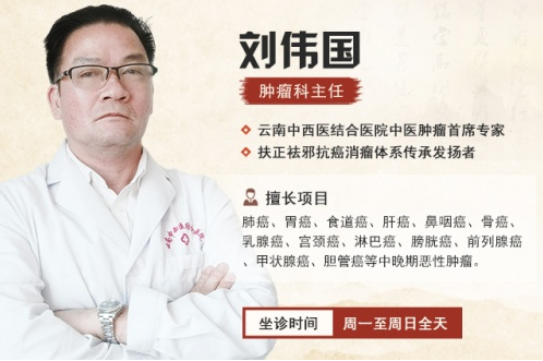 刘伟国,毕业于北京中医学院,曾在中国人民解放军302医院、北京地坛医院进修学习,曾担任中国人民解放军73176部队医院肿瘤科,现任云南中西医结合医院肿瘤科。是国内中医肿瘤诊疗领域专家,在中医肿瘤等疑难疾病的研究诊疗方面有独特见解,对肺癌、胃癌、肝癌、胰腺癌、肠癌等中晚期肿瘤疾病的处理具有相当丰富的经验和技巧。
