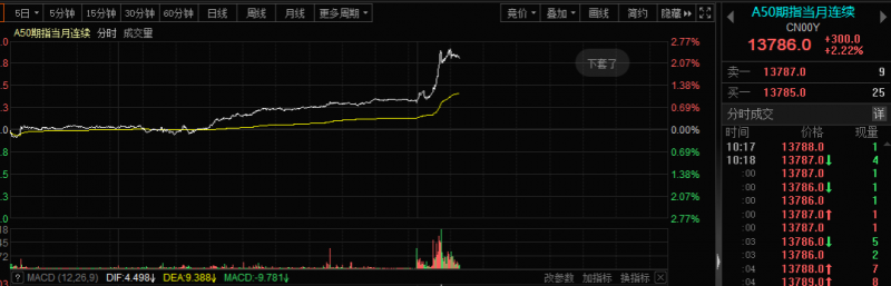今天外围市场开盘之后,富时中国A50指数期货的表现让人颇感意外,该指数开盘之后稍作停顿即直线拉升,最大涨幅超过2.5%。