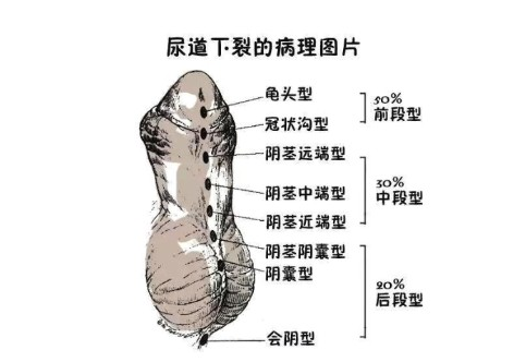 1:异位尿道外口。也就是说,尿道口可能出现在正常尿道口近端至会阴部尿道的任何部位;