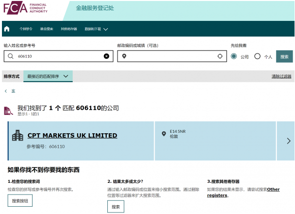 在外汇行业中,任何一家规范的公司都必然受到一家或多家监管机构的监管。美国期货协会(NFA)是最严格的监管局(有时候甚至过于严苛,导致很多经纪商离开美国市场)。一家公司拥有NFA,英国金融市场行为监管局(FCA),美国商品期货交易委员会(CFTC)或者其它知名监管机构的授权牌照,并不一定意味着这家公司很有诚信,但对投资者来说这的确是个有保障的平台。比如我们去英国FCA查询CPT Markets这家平台的监管信息606110就可以查询到,它是已经注册并接受监管的,所以当我们在这个平台进行交易时就能够放心我们的资金安全了。