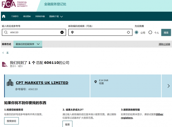 比如去英国FCA查询CPT Markets的监管信息616110就可以查询到,说明它是已经注册并接受监管的,这就比较放心了。
