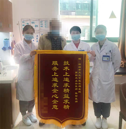 近日,来自惠州的患者徐先生到深圳天元中医肛肠医院肛肠科复查,将一面红底金字的锦旗送到高殿杰主任手中,上书“技术上追求精益求精,服务上追求全心全意”,对高殿杰主任和医护人员表达了诚挚的感谢。