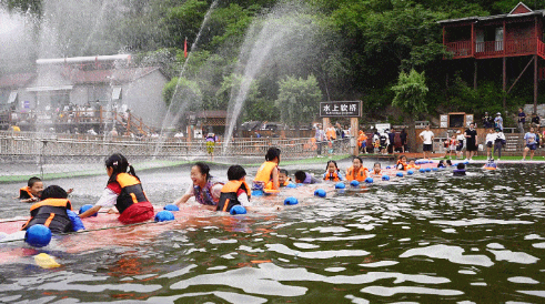 清凉谷打造的大型水上闯关项目——《快乐向前冲》,共分为击鼓喷泉、水上软桥、凌波微步、水上浮萍、水上钢丝、网红桥等水上娱乐项目,看似简单却考验技巧,一不小心就会上演花式落水,让参与者享受到水上冲关的刺激和快乐。