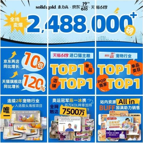 除此以外,Solid Gold素力高618战报也十分亮眼。京东两店同比增长10倍,天猫旗舰店同比增长120%,成为天猫平台进口猫主粮店铺、单品双料NO.1,京东宠物行业单品类目、POP商家双料NO.1。