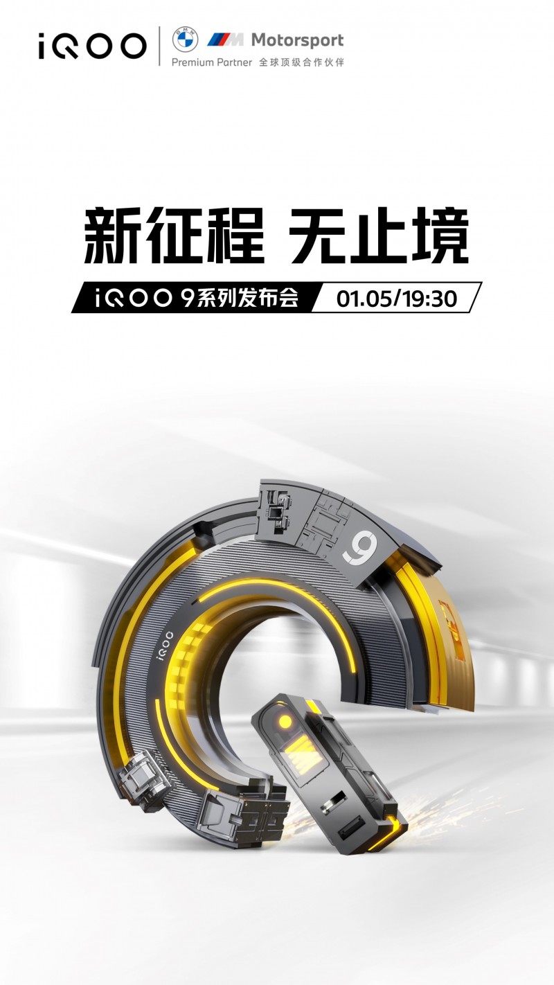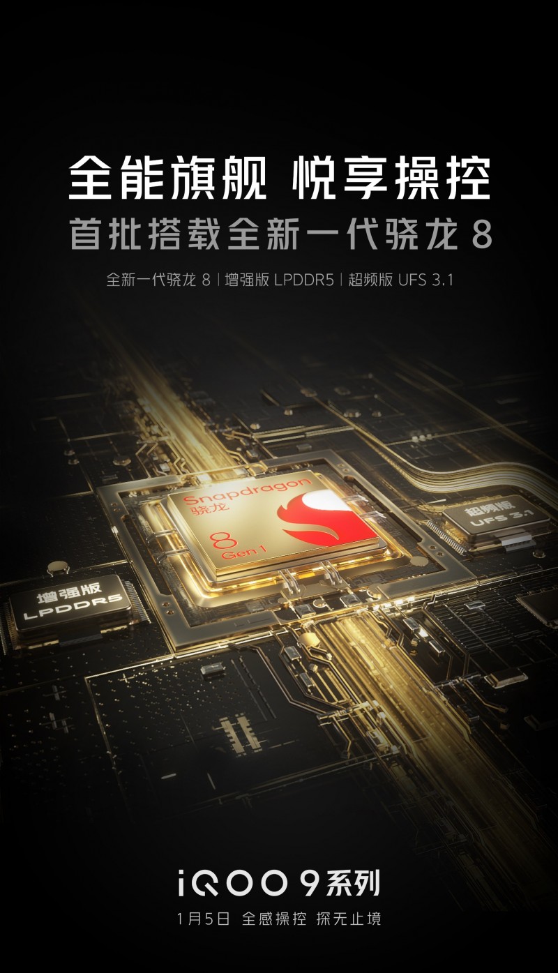 2021年12月27日,@iQOO手机 官方微博公布“新征程 无止境”新品发布会海报,宣布全新旗舰产品——iQOO 9系列将于2022年1月5日正式登场,并确认将全系首批搭载全新一代骁龙8移动平台领衔的超强“性能铁三角”,拥有创新的叠瀑VC立体散热系统。实力强劲,自然出色,iQOO 9系列驭强则强,驰骋性能赛道,必将成为新一代旗舰性能标杆。