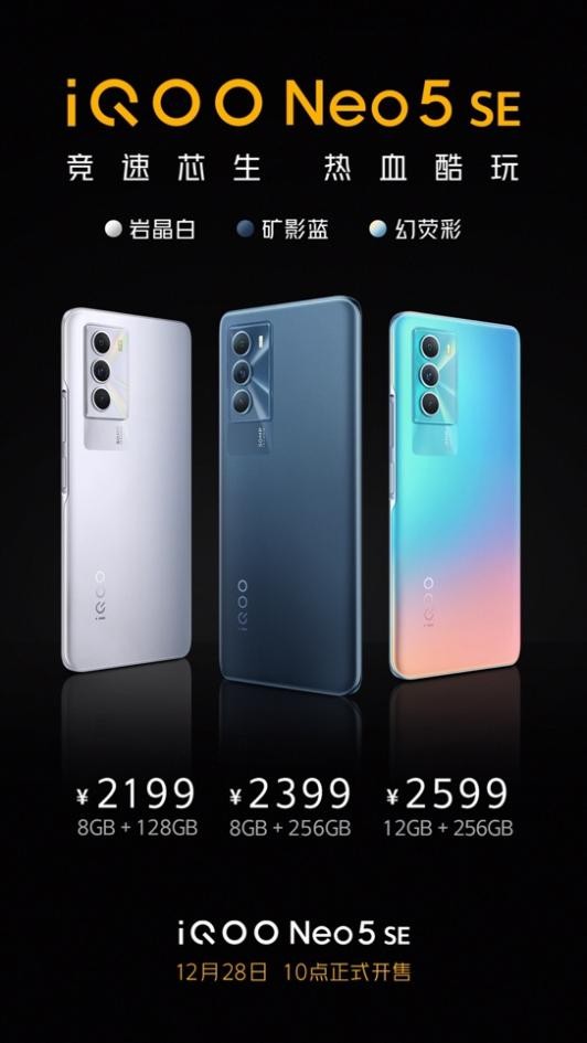 12月20日,iQOO发布了旗下最新产品iQOO Neo5S和iQOO Neo5 SE。iQOO Neo5S已于24号正式开售,首销当日斩获多平台销量&销售额双冠军;而Neo系列另一款新品iQOO Neo5 SE也将于明日(12月28日)上午10:00在vivo官网、京东、天猫、苏宁易购、拼多多等渠道正式发售,iQOO线下专卖店、电竞馆、及各大授权门店、vivo体验店同步开售。