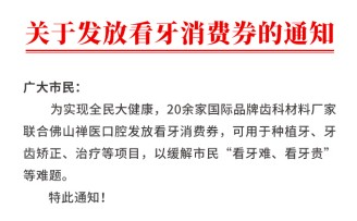 佛山市及周边居住的人群,非佛山户籍人员均可申领额度不等的看牙消费券。