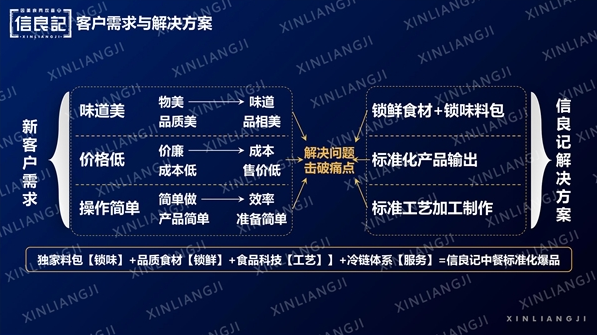 在解决客户需求方面,产品味道美(物美,味美,品质美,品相美)价格低(价廉,成本低,售价低),操作简单(产品简单,准备简单),通过锁鲜食材+锁味料包,达成了标准化产品输出以及标准工艺加工制作的特点,这样的信良记中餐标准化爆品解决方案能够满足客户的实际需求。