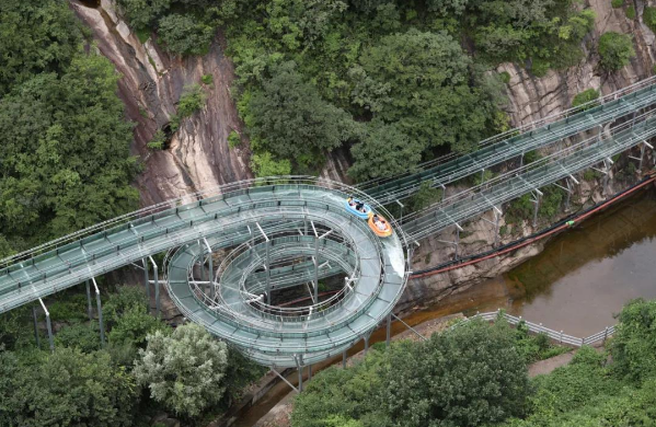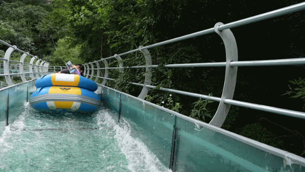 但在清凉谷,沉浸式嗨玩只需选一种心仪的颜色,坐上皮筏艇在3000多米长的高空悬浮漂流,落差200米,360度多层环形盘旋,带给你的刺激感不可言喻。