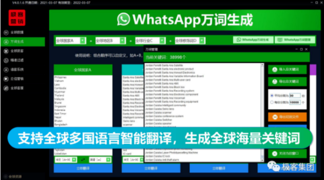 对于跨境电商来说,获客的关键就在于全球私域流量的获取,而全新上线的极客全球WhatsApp大数据获客系统“全球数据”功能模块下,打造WhatsApp全球180个国家各行业私域流量池,一键导出,方便快捷。而万词生成功能模块则根据全球各个国家、各个地区、各个行业的地域属性,自动生成万词,实现全球精准采集。而全球获客功能更是囊括活跃私域池、WS私域池、WS小组私域池、FB主页私域池、FB小组私域池、INS私域池、LBS私域池、领英私域池8大WhatsApp采集功能,立体化精准采集,只有错失的机会,没有获取不到的流量。