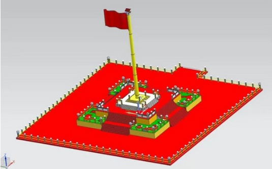 旗杆采用鎏金钛合金钢体,雕铸祥云、山水纹图案,下半部分雕刻九龙缠绕,体现中华民族是龙的传人,杆体四级伸缩整体能迎风转动设计,有槽口喷射气流,保证旗帜在上升、下降或固定时,旗帜始终迎风舒展飘扬。