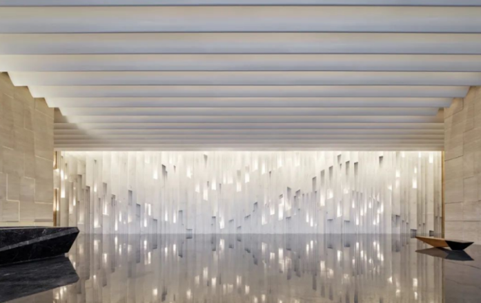 博物馆大厅的难度显而易见,会议中心的大堂同样如此。它的施工难度在于主背景墙石材的造型复杂且面积庞大,业主方提出背景一定要彰显庄重华贵气质,且还要保证所有石材凸出的尖角必须保持坚挺,且不许海棠角、不许磨圆边,给项目部带来了巨大挑战。为了保证达到业主需求效果,防止后期出现返工,材料浪费现象,项目部通过互相交流,决定采取深化节点、交由供应商先做打样,对不合理区域进行了多次调整,直至业主满意。