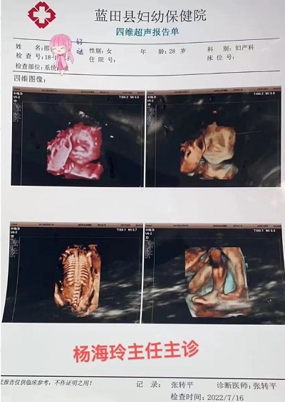 好孕四:孕妈邵女士四维检查顺利通关,通过另外一位怀孕的妈妈介绍专程找到杨海玲主任就诊,很快查清楚不孕病因对症治疗,快速迎来怀孕的消息,孕后第一时间积极保胎,一路通关到现在,恭喜她祝愿生个聪明伶俐宝贝!