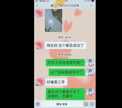 好孕一:乔女士24岁,有过一次不良妊娠史,在家人的介绍下来杨海玲主任的门诊,经过检查给予精准治疗方案及备孕指导,现在传来了好孕的好消息,给予远程指导保胎中,祝愿后期一切顺利!