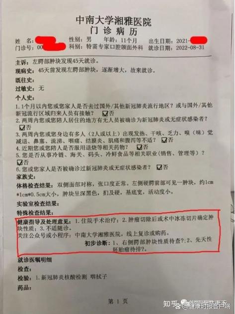 (健康时报周欣雨)近日,处于舆论风口浪尖的湘雅系医院再次登上热搜。湖南长沙有家长反映11个月大孩子上颚出现黑色肿块,花300元在中南大学湘雅医院看专家号,专家初步诊断疑似肿瘤,待查待排。处理意见是住院手术治疗。