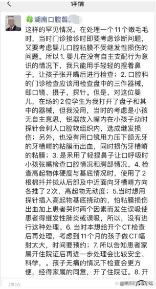 9月12日,翦医生再次在朋友圈发布了回应,“我把我当时为什么没有直接用口腔探针去从这个物体底部挠动,是怕造成婴儿口腔粘膜的继发性损伤,如果一个11个月的孩子出现窒吸门诊没有处理条件,而改用2根棉扦并扰探试物体硬度和基底的宽度后,而争得患者父母同意开住院证入院进一步处理。”