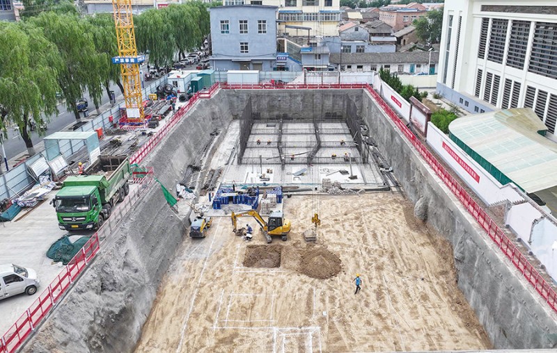 来到长平广场便民服务市场及停车楼项目施工现场,塔吊林立,机械轰鸣。工人师傅们头顶烈日、迎战高温,分布在各个施工区域,紧锣密鼓地进行钢筋绑扎、模板搭设、防水层铺设等作业,掀起了夏季施工建设的热潮。“面对高温高热天气,我们采取了调整作业时间、发放防暑降温用品等措施,在保障工人身体健康的同时,加快推进工程建设。目前,基础开挖完成40000立方米,地基处理工程完成三七灰土回填4500立方米,防水层铺设4500立方米,基础筏板钢筋浇筑完成,负一层主体钢筋绑扎模板搭设50%。”该项目安全总监苏渝森介绍说。