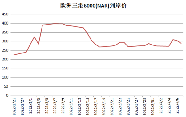 上周大西洋动力煤价格继续上涨,尤其在4月5日欧盟提议禁止所有俄罗斯煤炭进口,作为入侵乌克兰后第五波制裁的一部分。当天价格随之飙升,欧洲三港6000大卡/公斤NAR到岸价当日跳涨37美元,达到310美元/吨,之后几天回落。然而,禁令在4月8日得到确认后,日内煤炭价格再次出现飙升,当日上涨15美元,至305.05美元/吨。市场预计由于七国集团准备将俄罗斯煤炭从其能源篮子中剔除,并寻求替代吨位,欧洲的需求在短期内会重新启动。