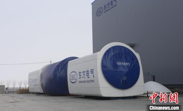 3月8日,在木垒县新疆东方风电新能源有限公司车间外,一台正在准备运走的风力发电机组。陶拴科摄