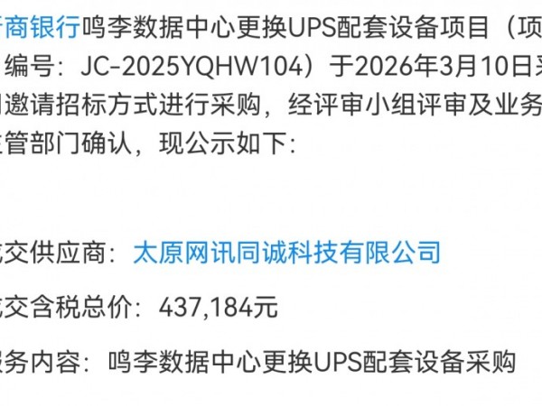 太原网讯同诚43万中标晋商银行鸣李数据中心