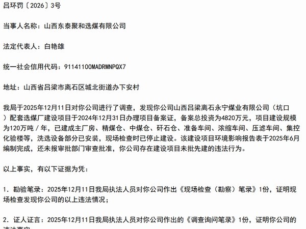 未批先建!山西东泰控股旗下山西东泰聚和选煤被处罚48.2万元