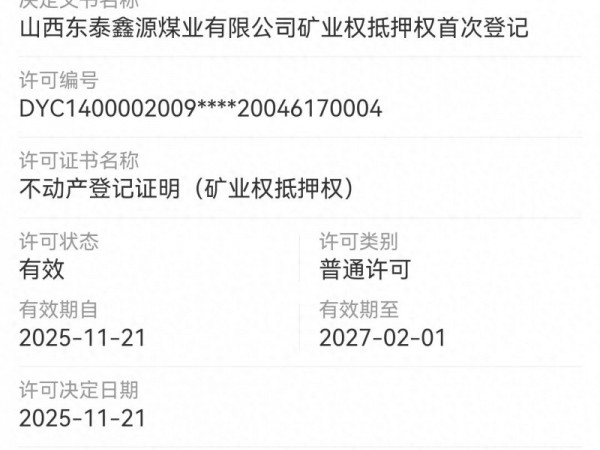 山西东泰鑫源煤业首次办理矿业权抵押权登记