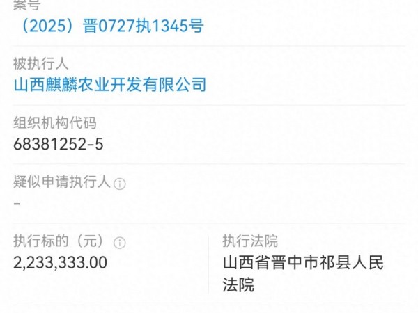 山西麒麟农业被执行220多万