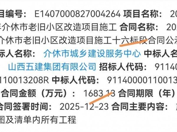 山西五建集团以1600多万中标介休市老旧小区改造施工16标段
