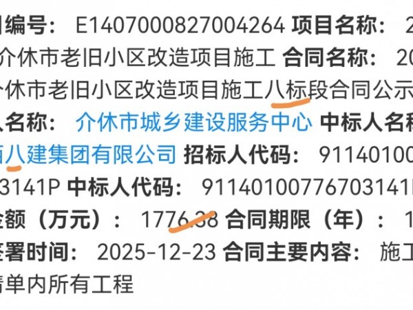 山西八建集团以1700多万中标介休市老旧小区改造施工8标段